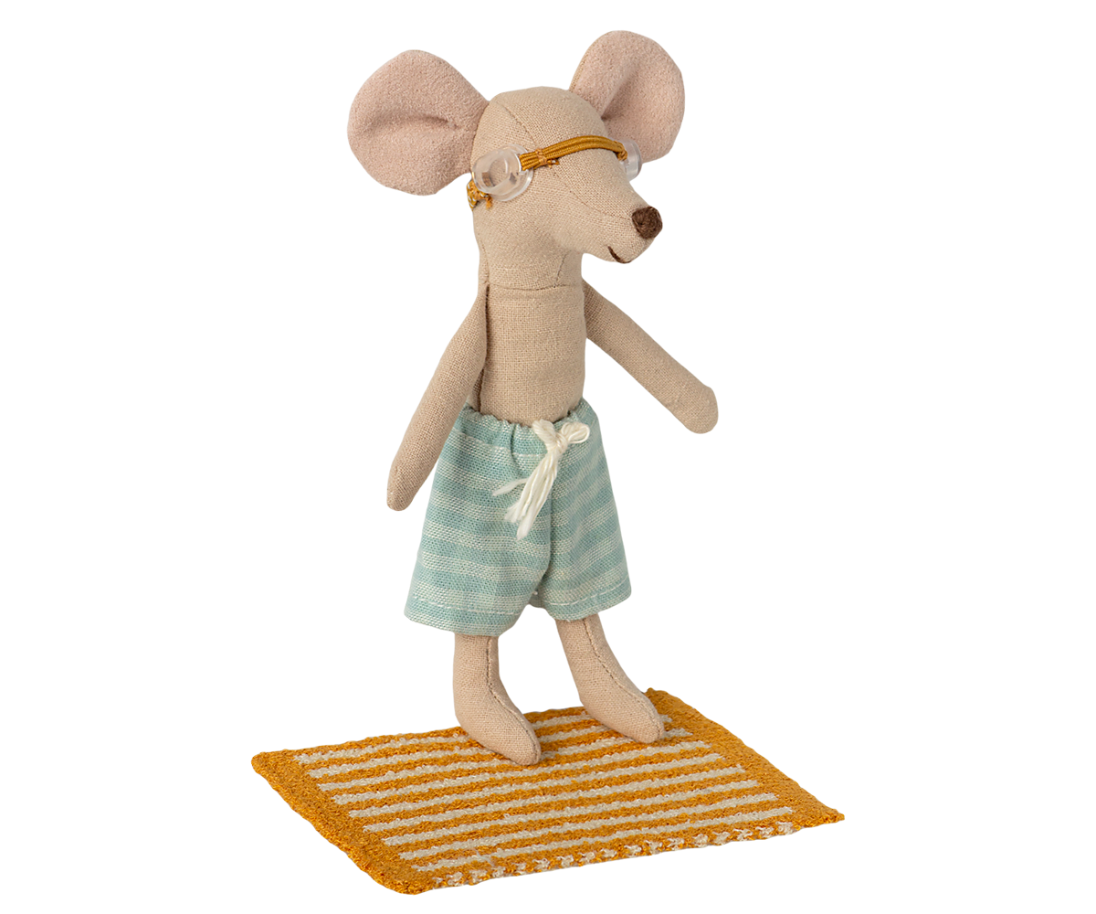 Vacation time. This set includes all essential accessories for a fun day at the beach: trunks, goggles, and a towel. It all fits the mice in size big brother/sister perfectly.