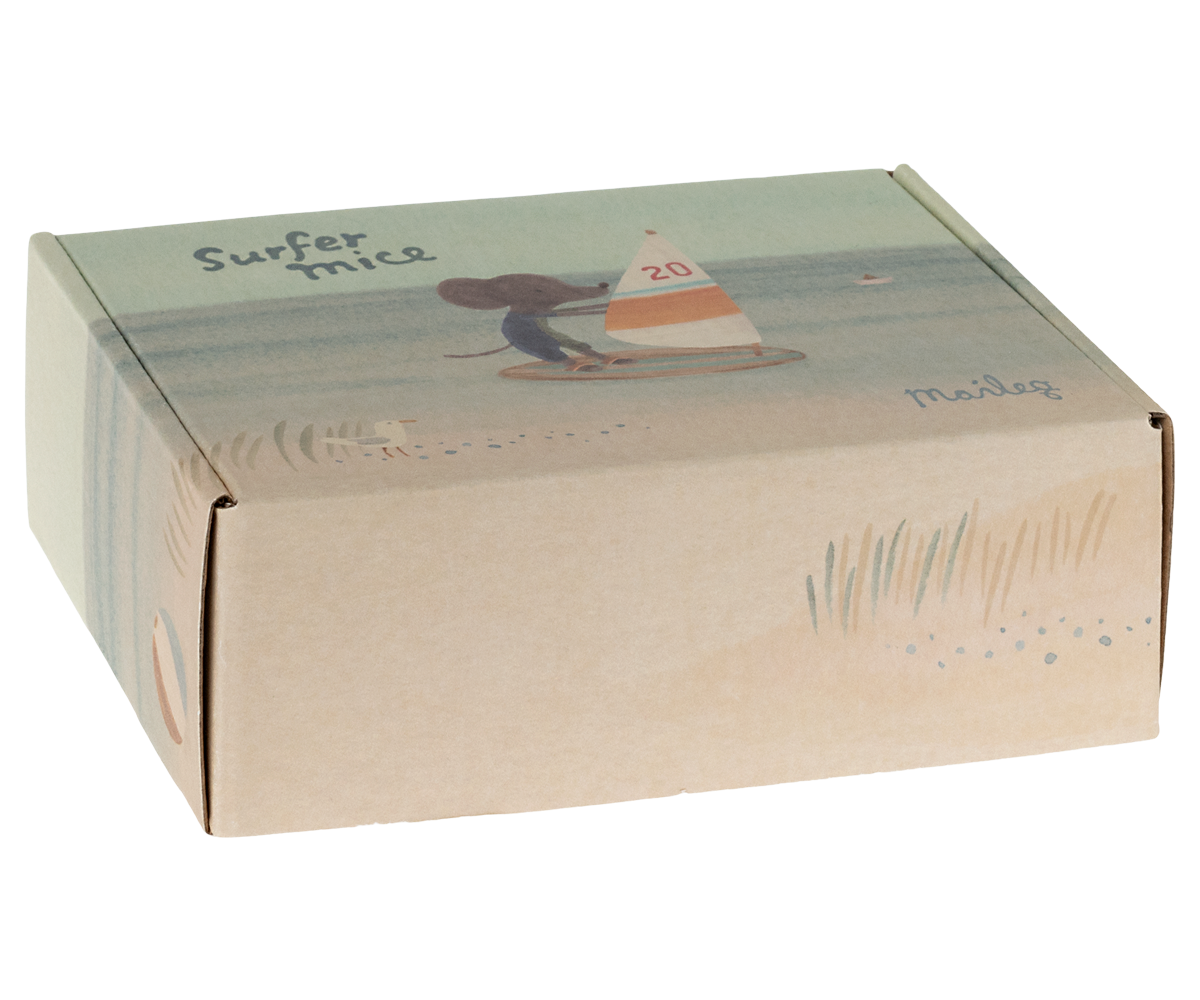 Little brother is learning how to surf alongside his sister! He’s wearing a half n half colored wetsuit that is dusty blue and forest green. His surfboard is dusty blue and off-white striped and his sail matches his sister marked with #20. The surfboard includes two elastic straps at the bottom so he can keep his feet in place. He also has magnetic hands, so he can steer his sail wherever he wants to go!